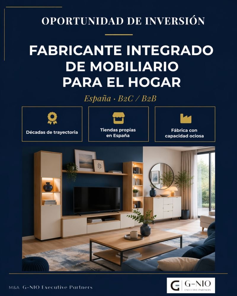 En G-NIO Executive Partners gestionamos en exclusiva el mandato de venta de una compañía industrial española del sector mueble para el hogar, con una sólida trayectoria y una posición consolidada en el mercado nacional.